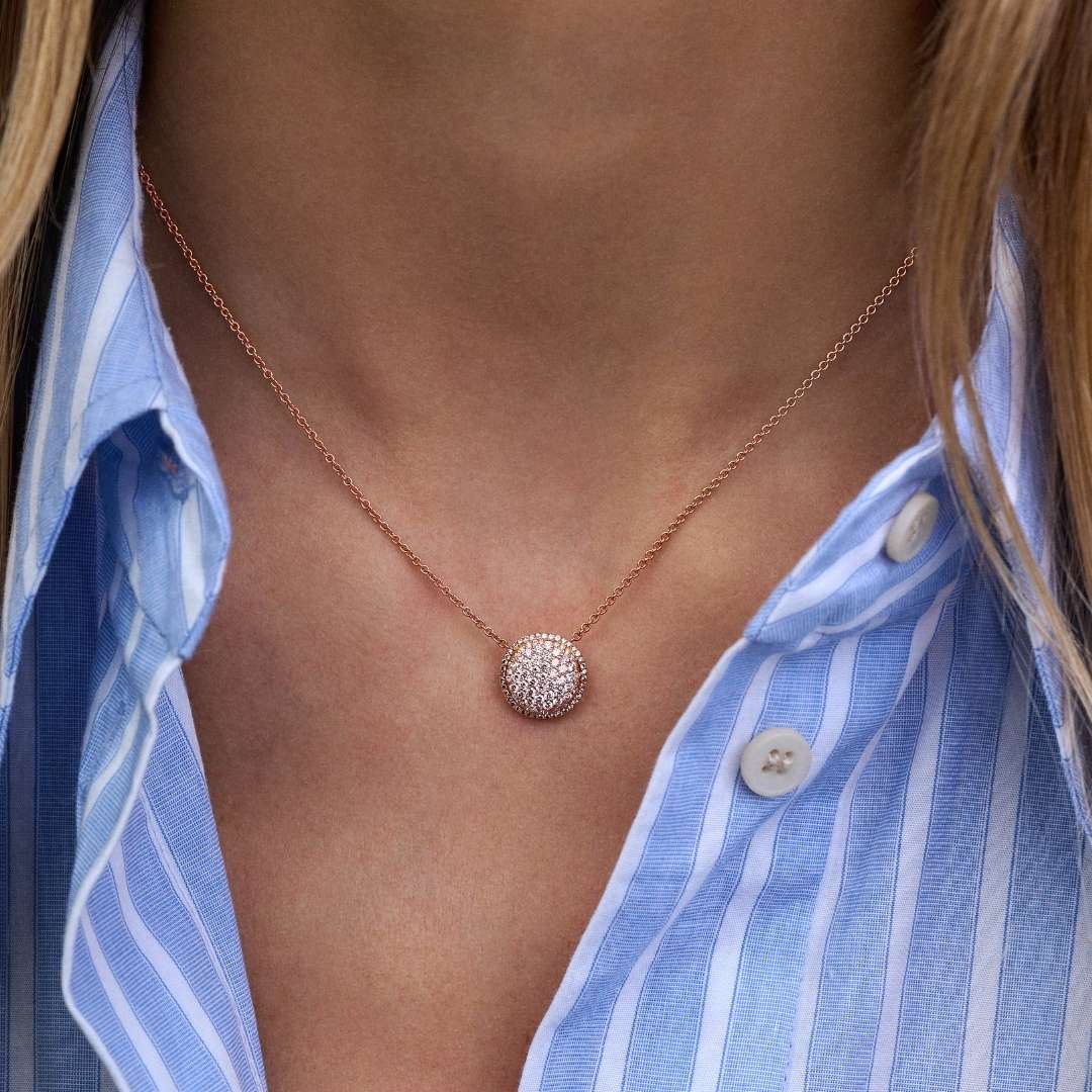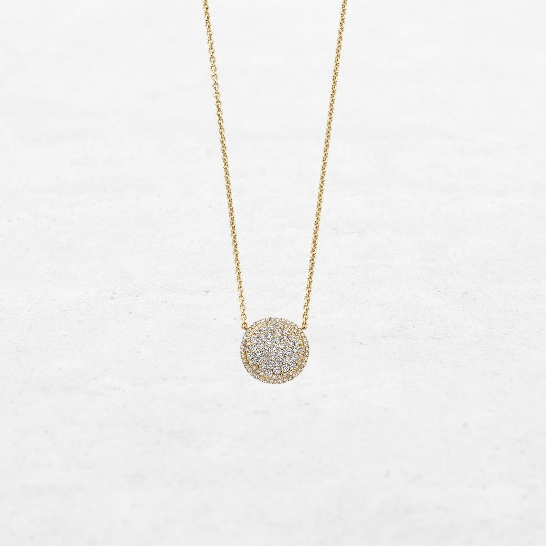 Plateau Luminous | OP-5883 is een elegante klassieker met een verrassende twist. Geïnspireerd door de Plateau collectie, is deze ketting vervaardigd van 18 karaat goud en voorzien van een platte, ronde hanger die volledig is bezet met stralende, natuurlijke diamanten.