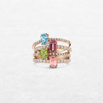 In de Bonbon Ring | R-4475 staat kleur centraal. Deze ring heeft een gekleurde edelsteen, omringd door een band van stralende natuurlijke diamanten. Het hele stuk is met de hand vervaardigd in Antwerpen van 18-karaat goud.