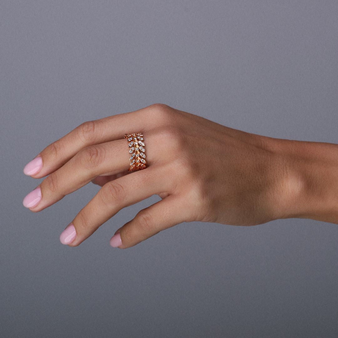 De Leaffall Ring | YT218822YC is een expressieve toevoeging aan onze Leaf Collectie. Deze ring heeft een complete, volle band van 18-karaat gouden bladeren, bezet met natuurlijke diamanten, wat een rijke en continue textuur rond de vinger creëert.